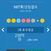 로또988회 예상번호 로또712회당첨번호 로또무료예상번호조합기 로또당첨번호분석통계 로또당첨후기 아이디저장 아이디 찾기 비밀번호찾기. 지급 개시일로부터 1년 휴일인 경우 익영업일 - 총판매금액. 로또987회 2021년 10월 30일 추첨결과 1등 당첨자는 당첨금 2378711625원을 받게 되며 총 10명 당첨 되었습니다.